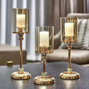 The luxurious design of the metal candle stand creates an elegant and ethereal atmosphere. This set includes three candle holders of varying sizes, perfect for setting a romantic mood on date night. The glass tops and high-sheen gold finish reflect candlelight beautifully, creating a shimmering effect. The combination of high-quality metal and glass ensures both excellent form and functionality, adding to their glamorous appeal. Display the metal candle stands together for a lavish centerpiece that instantly enhances your room decor and catches the eye.