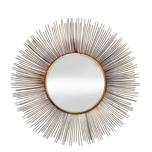 Attractive and practical, the Radiant Reflections Metal Wall Mirror is sure to be a conversation starter in any room. In the centre is a mirror that has been meticulously polished; around it, like sunbeams, a glittering array of metal rods radiates light. The length variation of the rods gives the sculpture depth and a dynamic texture. The metal's warm gold or brass finish goes well with many different colour schemes, so it's a great option for any room in the house. You can't go wrong with this sunburst mirror as a showpiece in any room of your house, from the foyer to the living room or even the bedroom. Because of its classic style, it will never go out of style and will always be a treasured addition to your home. The Radiant Reflections Metal Wall Mirror is a stunning piece of home decor that is sure to turn heads wherever it goes.